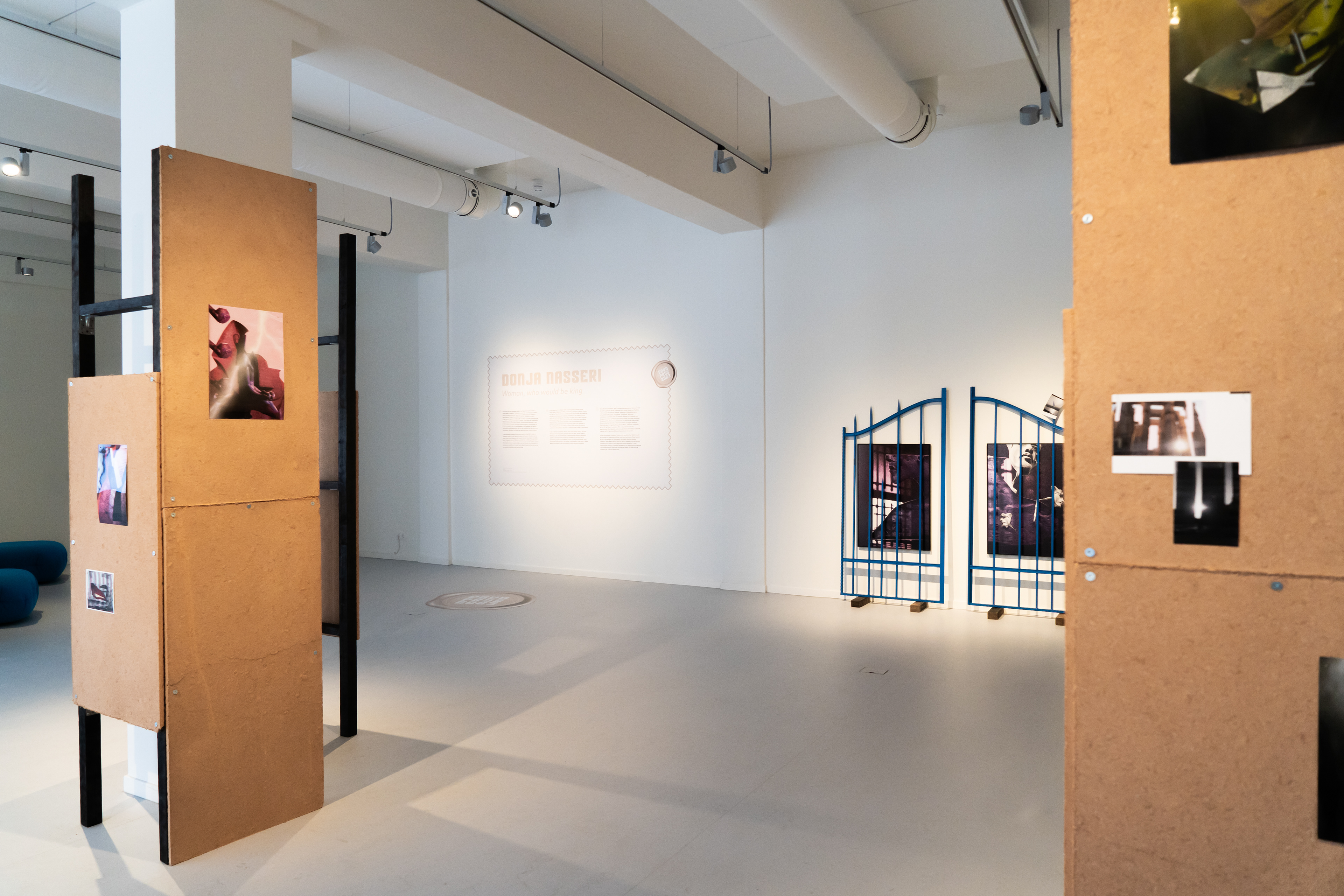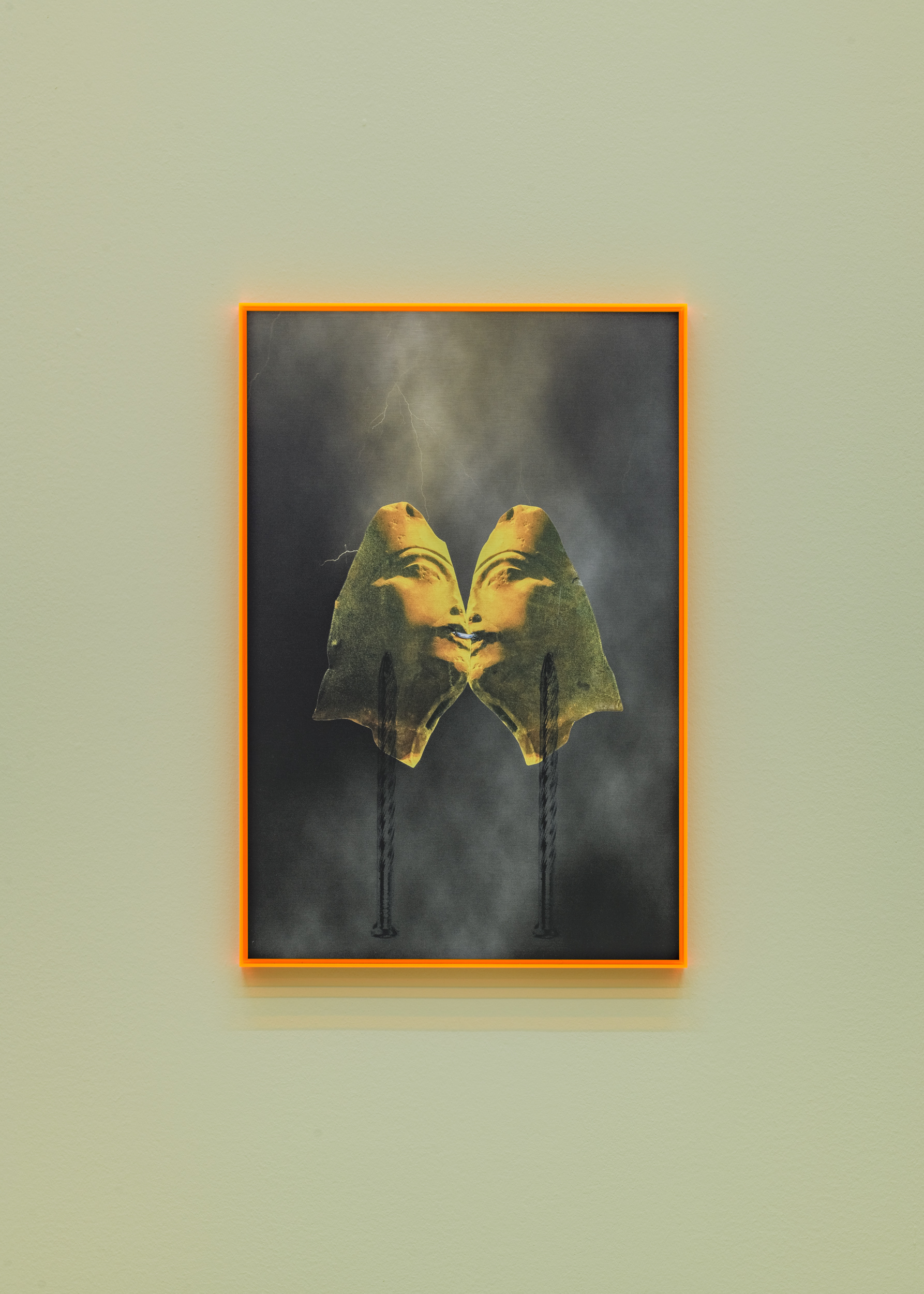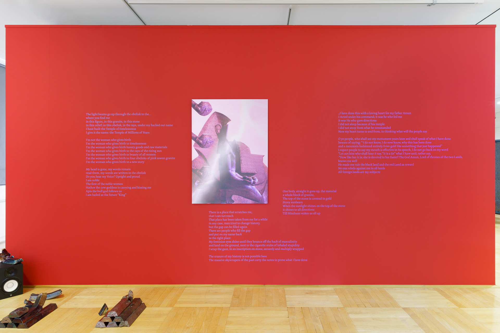 In her work, she explores the contingencies of Hatshepsut’s androgynous identities by creating a photomontage portrait of Hatshepsut in which her face is split in two. She places this portrait as a centre piece in the middle of the exhibition space. This photomontage seems to represent the radical split of the gendered subject that poses a set of problems by exploring gender as the cultural interpretation of sex – a cultural inscription of meaning on a pregiven sex. This portrait, in Nasseri’s lens, refuses to conform to the heterosexual matrix of conceptualising gender and power. It reifies these ostensible categories of ontology."